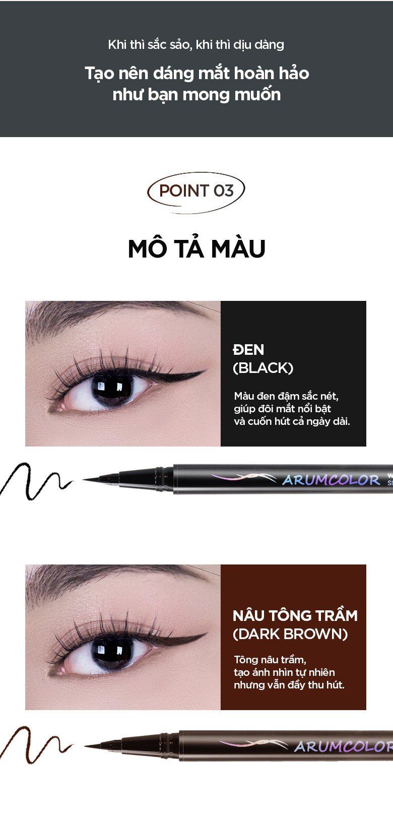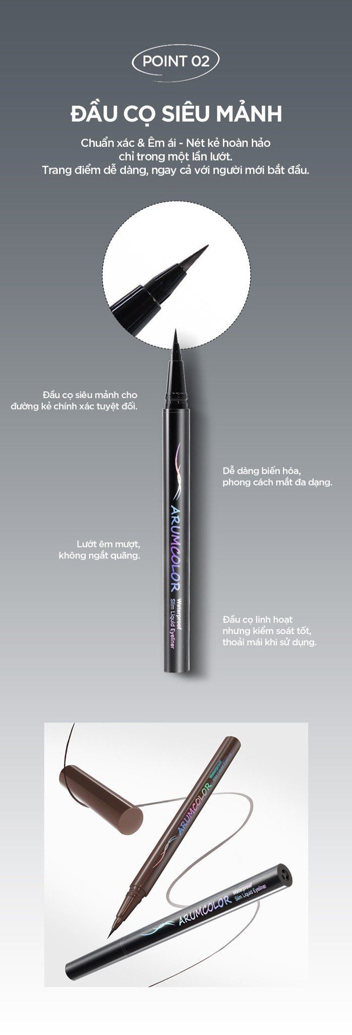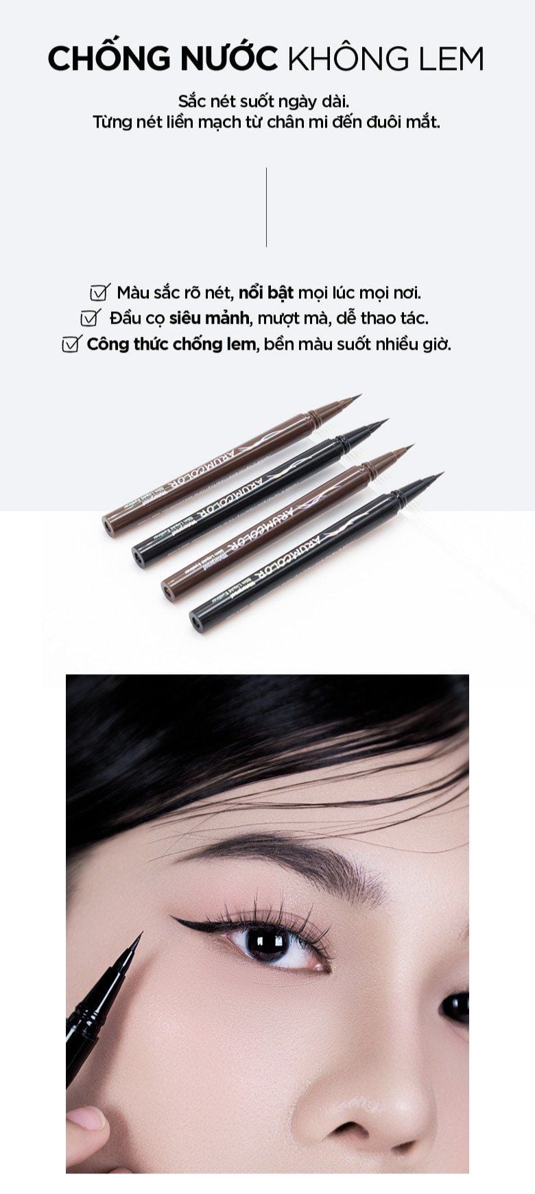 - Kẻ viền mắt siêu mảnh, chính xác, lên màu rõ ràng chỉ với một lần kẻ.